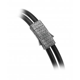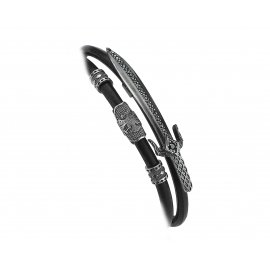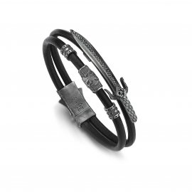 Double Wrap Black Natural Leather Sword Bracelet in Silver w/ Black Cz